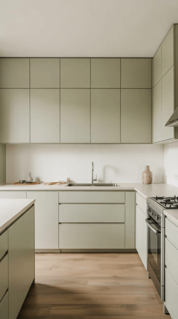 • Focus on Form: Choose cabinets with simple, flat-front (slab) doors and minimal visible hardware. The beauty is in the clean lines and the bold color block of green and white.