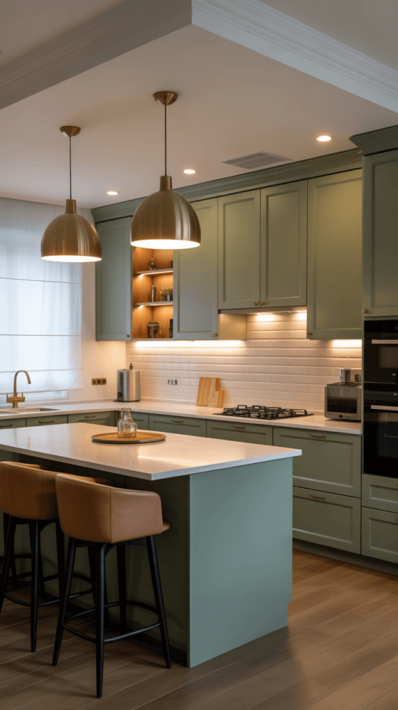 • Pendant Lights: These are your style statements. Hang them over an island or a sink. For green cabinets, brass, black, or even smoked glass pendants look fantastic.
