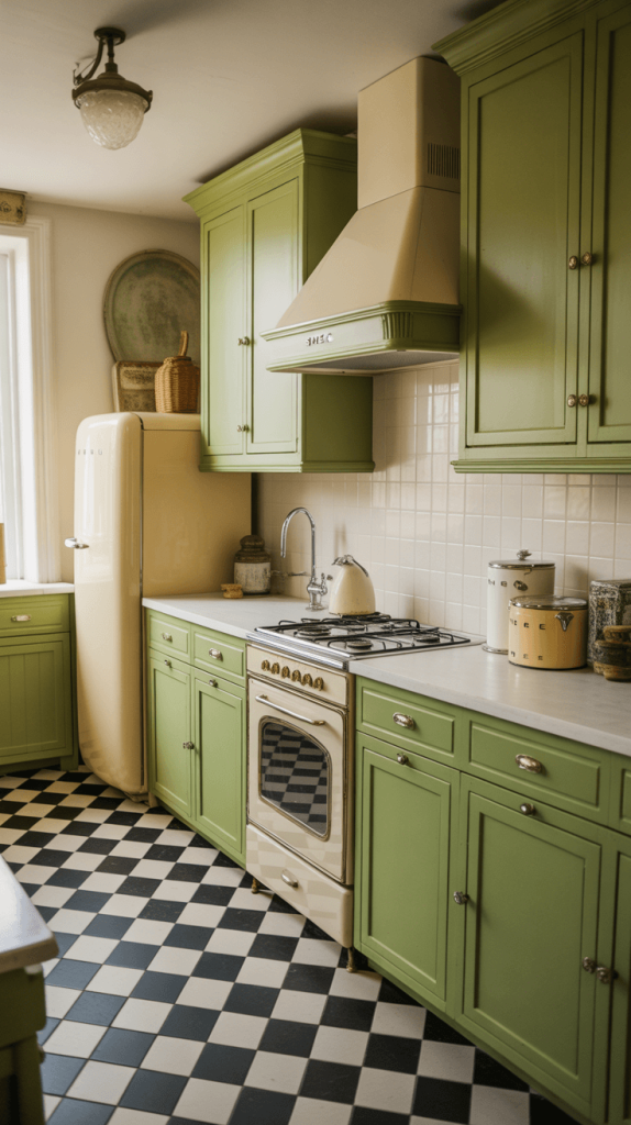 • Checkboard Floors: A black and white vinyl checkboard floor is a quintessential vintage look that pairs perfectly with green cabinets.