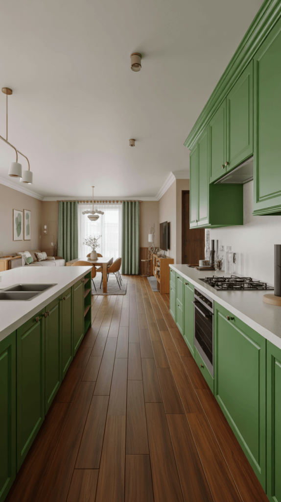 • Strategic Pops: Your green cabinetry is the decor. You don’t need much else. Maybe a single piece of art or a stunning vase on the counter, but let the architecture and the color do the talking.