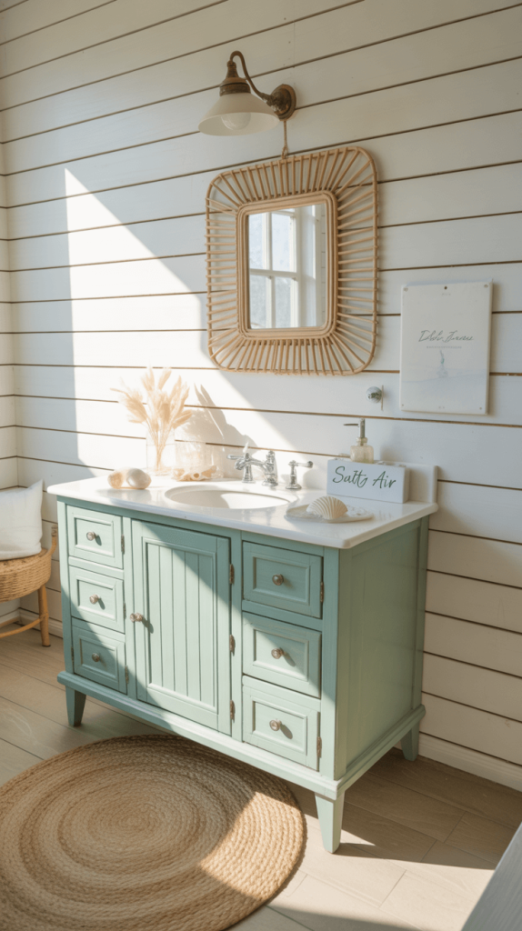 My personal take: Avoid anything too bright or primary. You want greens that are weathered, sun-bleached, and soft. Pair a sea-glass green vanity with a rattan mirror frame and a jute rug, and you’re 90% of the way there.