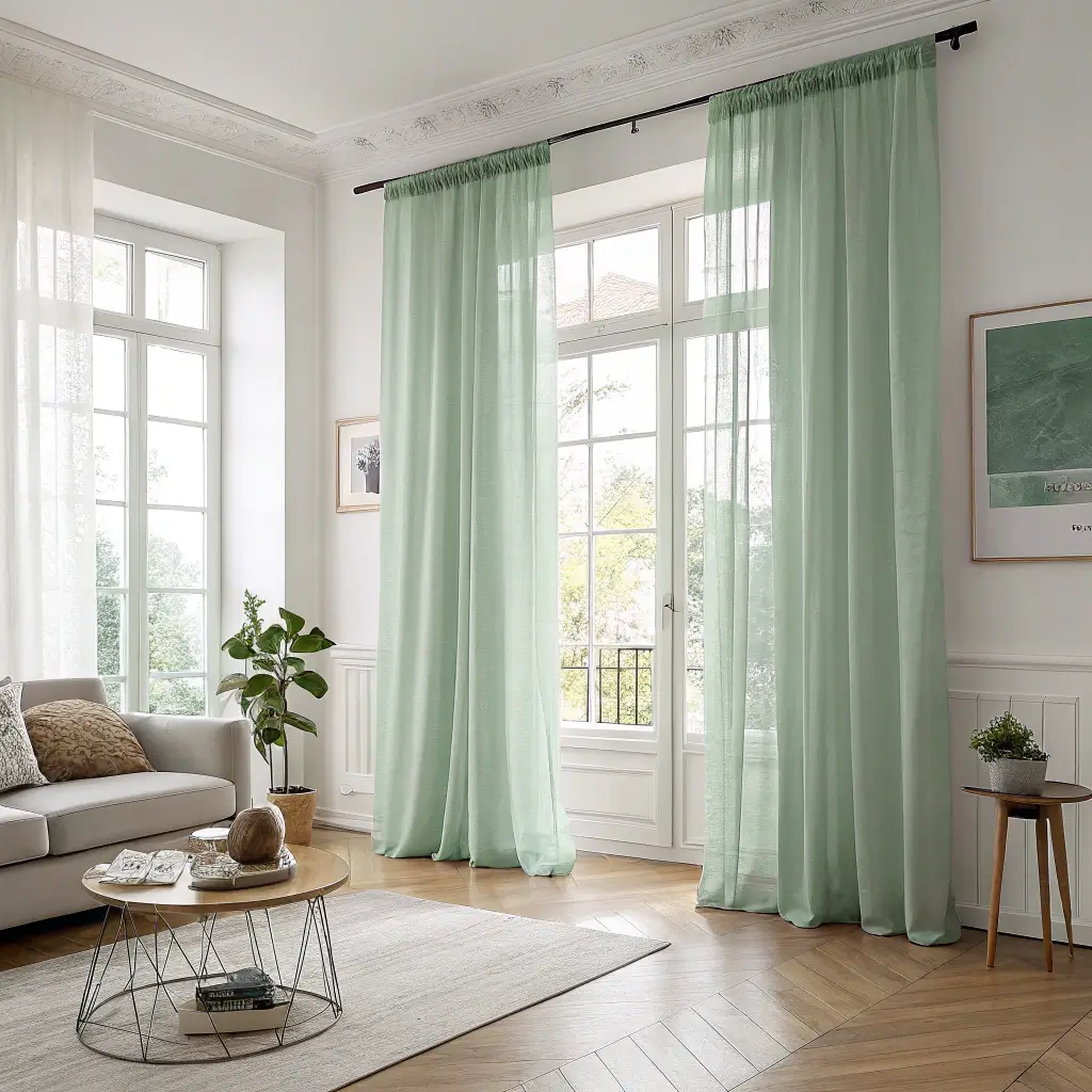 Let’s start with the combo that launched a thousand Pinterest boards. Sage green sheers against crisp white walls create this dreamy, ethereal vibe that makes every hour feel like golden hour. I installed these in my own living room last spring, and honestly? Game changer.