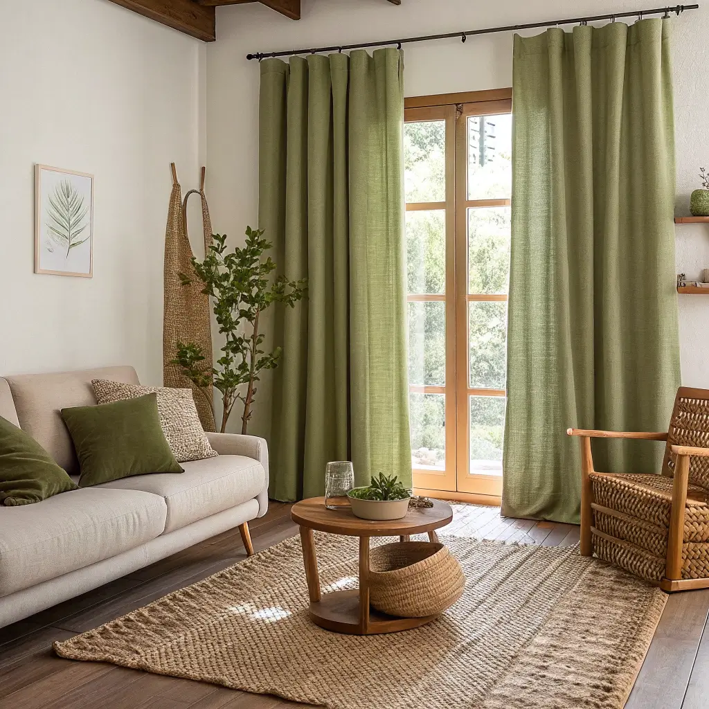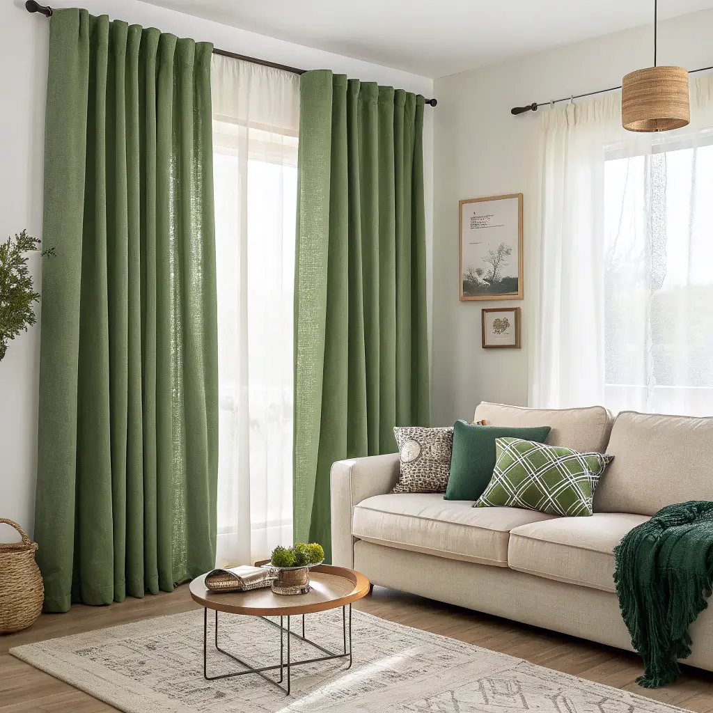 The neutral-natural pairing creates balance without boring. Your beige sofa provides a stable foundation while green curtains add life and movement. I’ve recommended this combo countless times, and no one’s ever complained about the results.