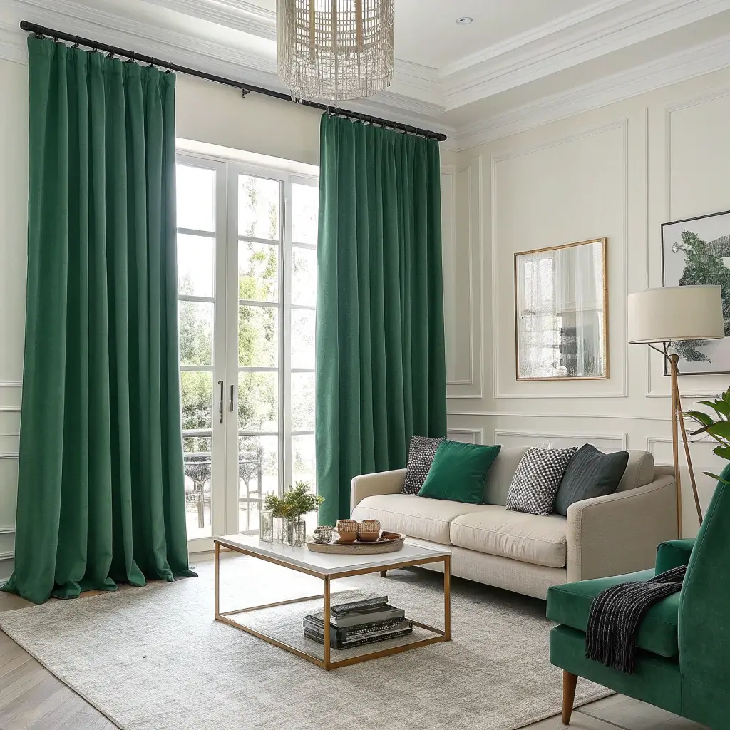Want to make a statement without repainting your entire room? Emerald green curtains against neutral furniture deliver maximum impact with minimum commitment. Think of them as the exclamation point in an otherwise chill sentence.