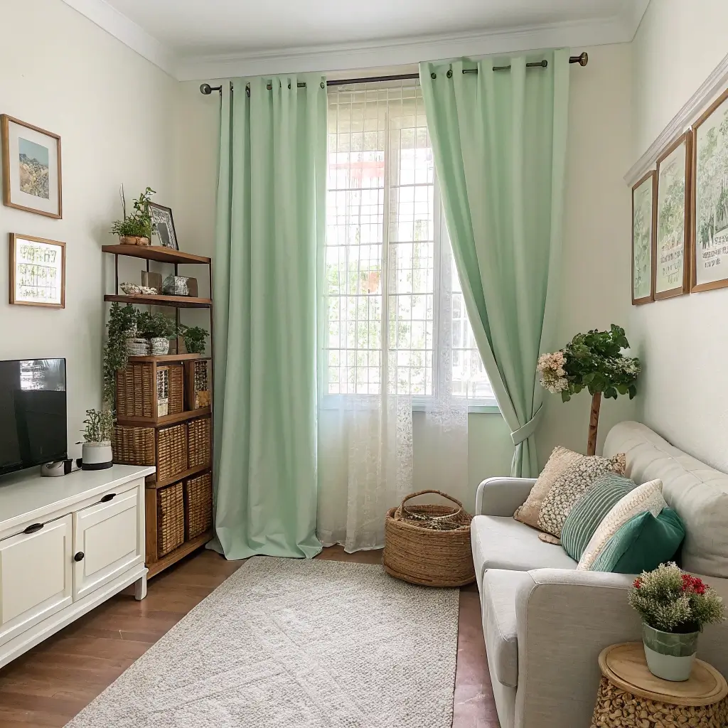 Small living room? Light green curtains might be your new best friend. They expand space visually while adding personality – basically doing what mirrors do but with more style.