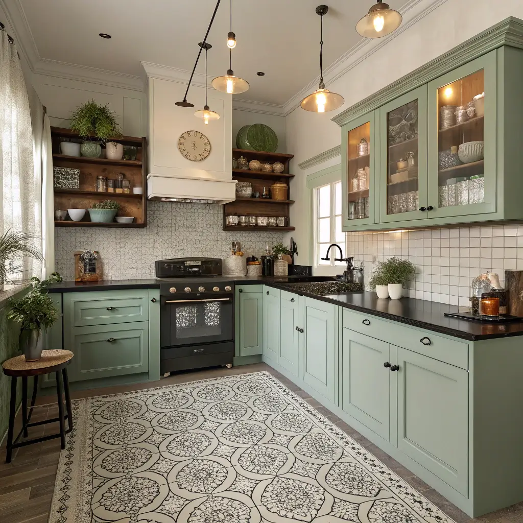 Vintage-Inspired Green Cabinets with Black Counter Accents