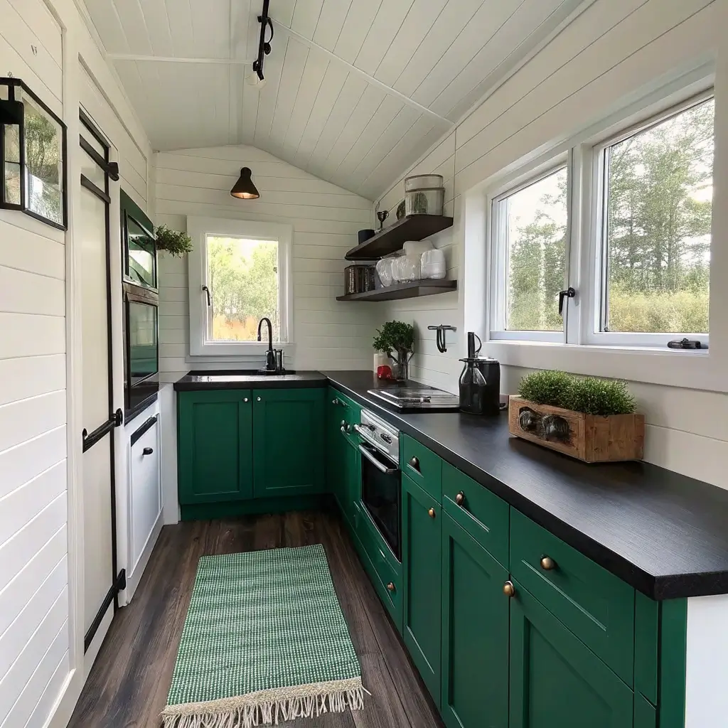 Small kitchens need smart solutions, and this trinity of green, black, and white creates the perfect balance. The white walls keep things bright, green cabinets add personality, and black counters provide sophisticated contrast.