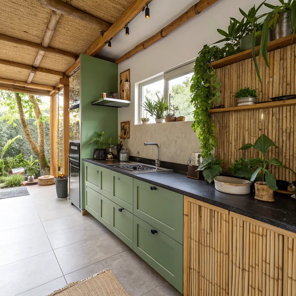 Eco-Friendly Green Cabinets Paired with Dark Countertops