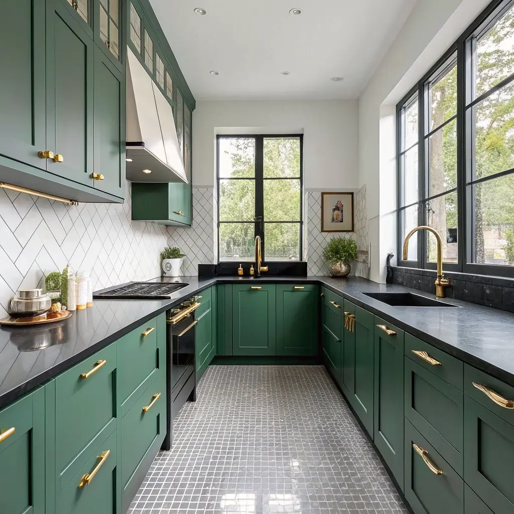 When I first saw this combination at a friend’s place, I thought she’d lost her mind. Who puts emerald green in a kitchen? But then I actually spent time in that space, and everything clicked. The way natural light bounces off those jewel-toned surfaces while the black countertops ground everything with their sophisticated presence creates this incredible visual balance.