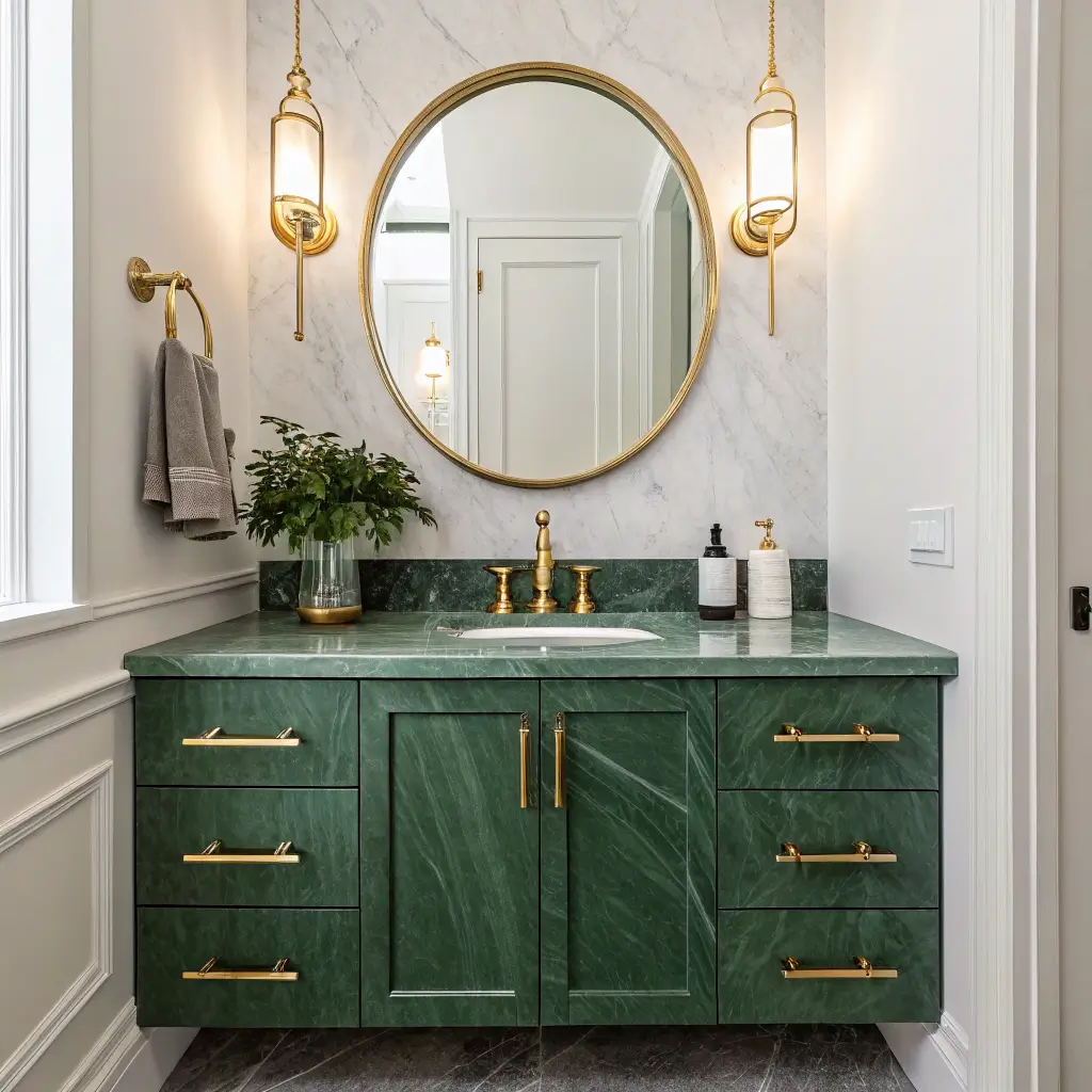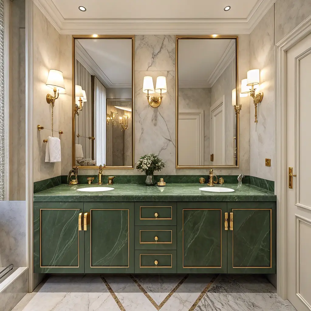 I helped design one of these for a client who was obsessed with Art Deco, and we used emerald green marble with distinctive white veining, paired with black and gold geometric floor tiles. The key is embracing the drama – think bold mirrors, statement lighting, and maybe even some peacock feather artwork.