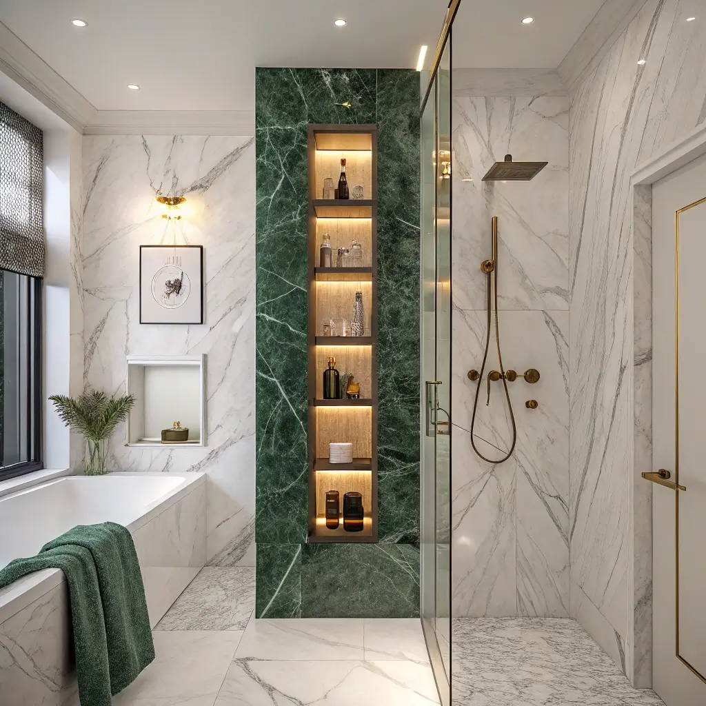 I discovered this trick when my full marble dreams met my actual budget :/. By creating a stunning green marble niche in an otherwise simple tile shower, you get that luxury detail that catches the eye without breaking the bank. Frame it with complementary tile, add some good lighting, and boom – instant focal point.