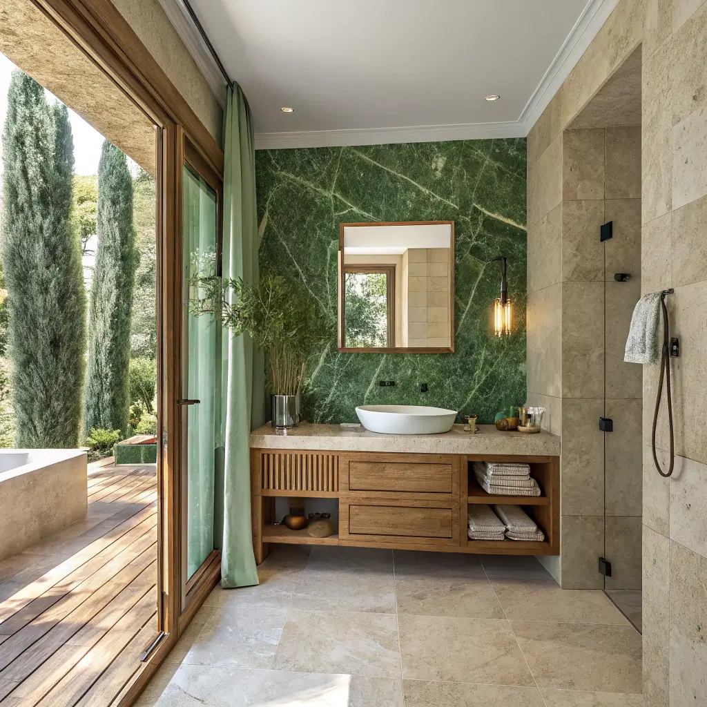 This combination makes my heart sing! Pairing green marble with warm wood creates this perfect balance between elegance and earthiness. Think walnut vanities with green marble tops, or teak accents against marble walls.