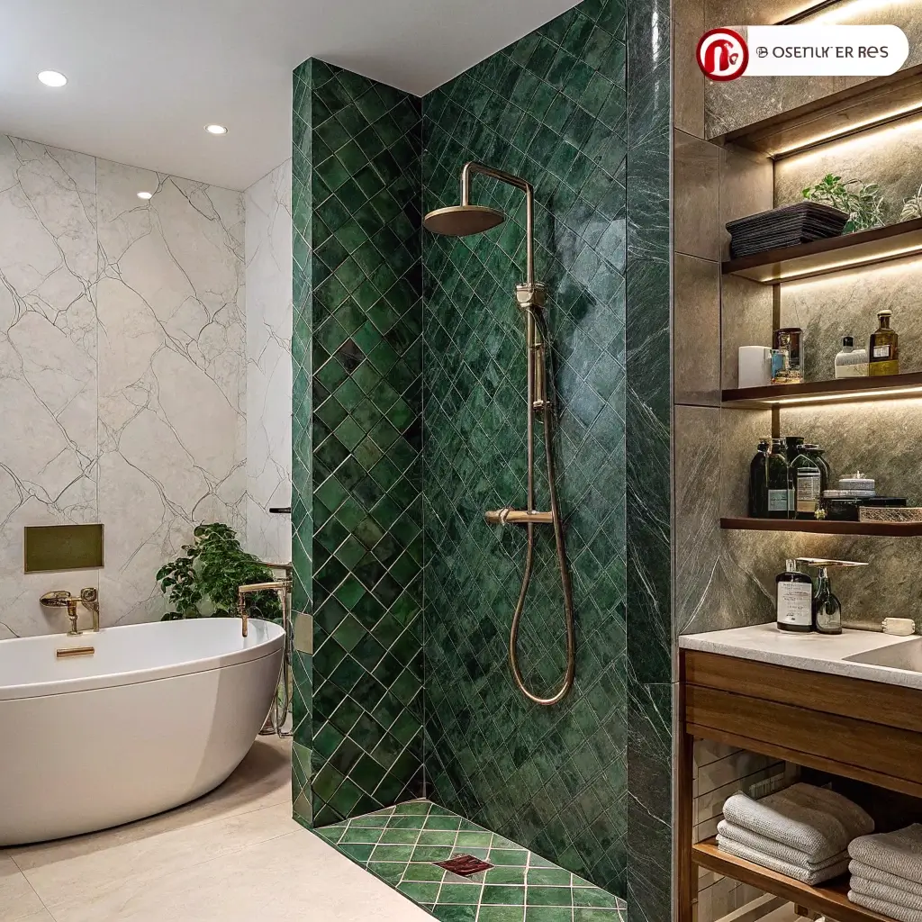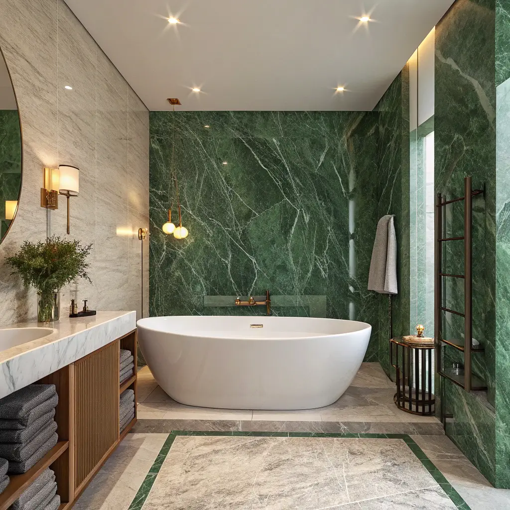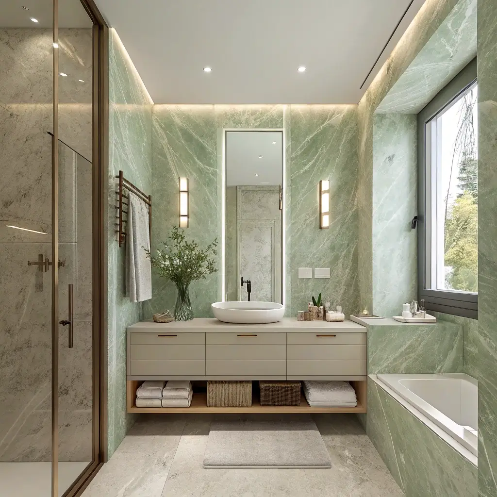 Want to really go for it? Floor-to-ceiling green marble creates an immersive, cocoon-like experience that’s absolutely breathtaking. Yes, it’s an investment, but the impact is undeniable.