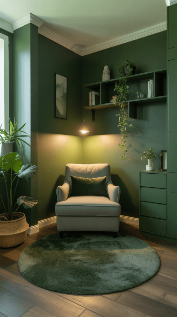 Finally, let’s create a dedicated zone within your bedroom for ultimate relaxation. If you have an unused corner, transform it into a green-themed reading nook.