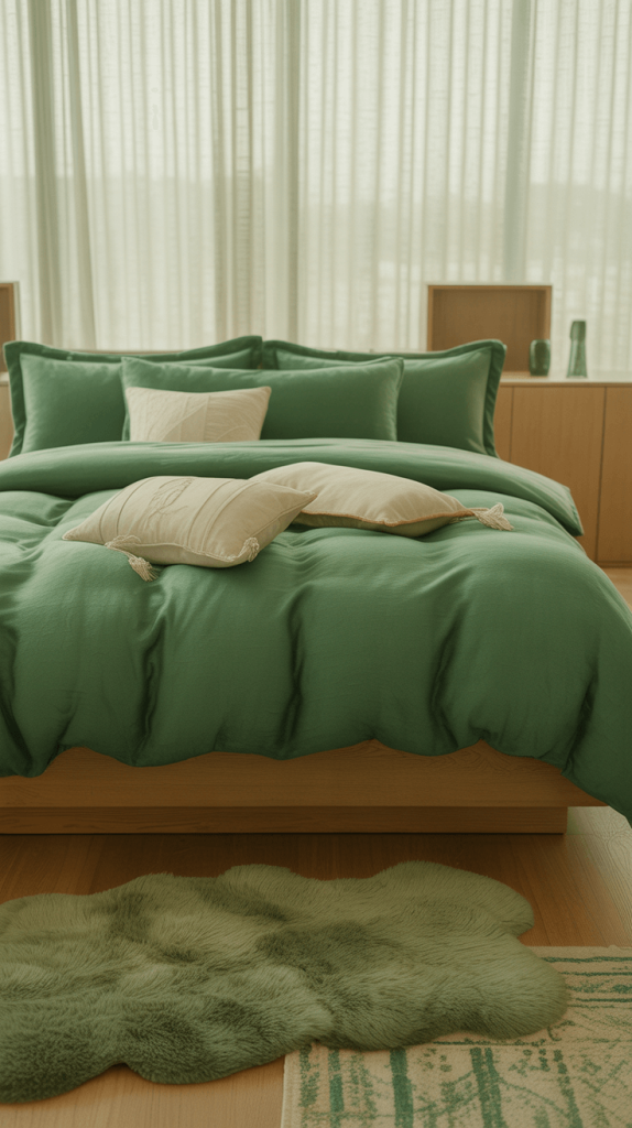 - Anchor with neutrals: Use a neutral base, like a white sheet set or a beige sofa, to let your green fabrics shine without competing.