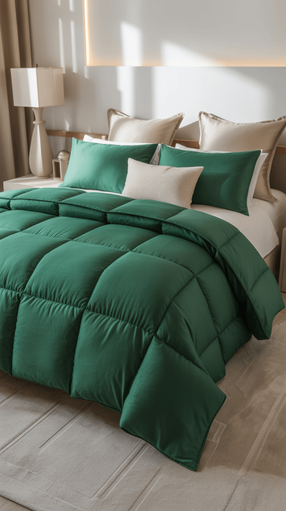 3. Bold Green Bedding for a Cozy, Inviting Look