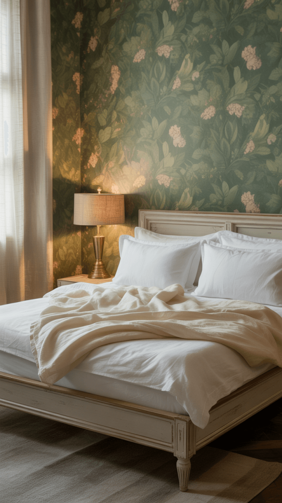 A green-based floral wallpaper brings life, pattern, and color all in one go. It can make your bedroom feel like a secret garden.