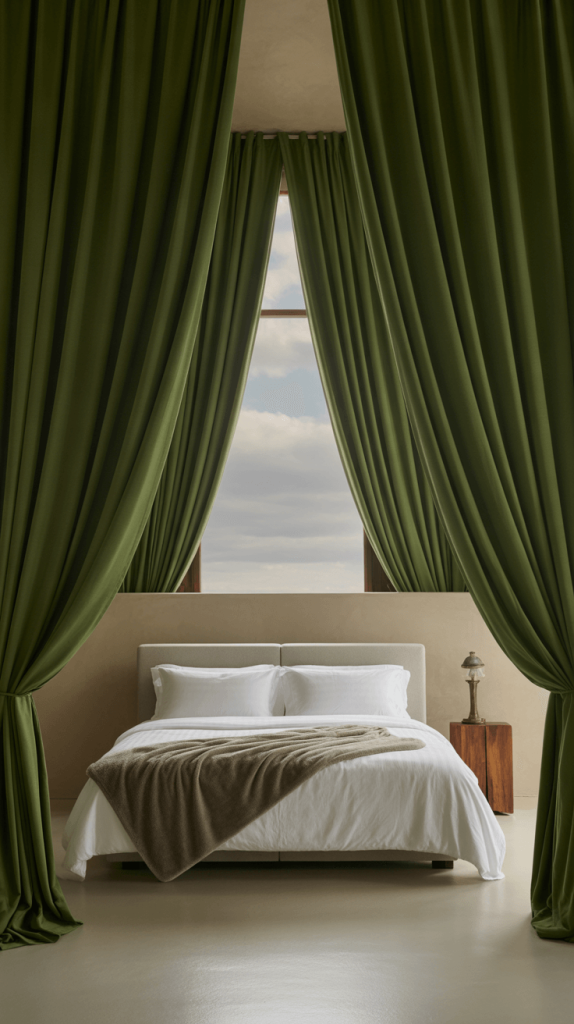 Choosing vibrant green curtains is a powerful way to frame your windows and add a dramatic, bold statement.