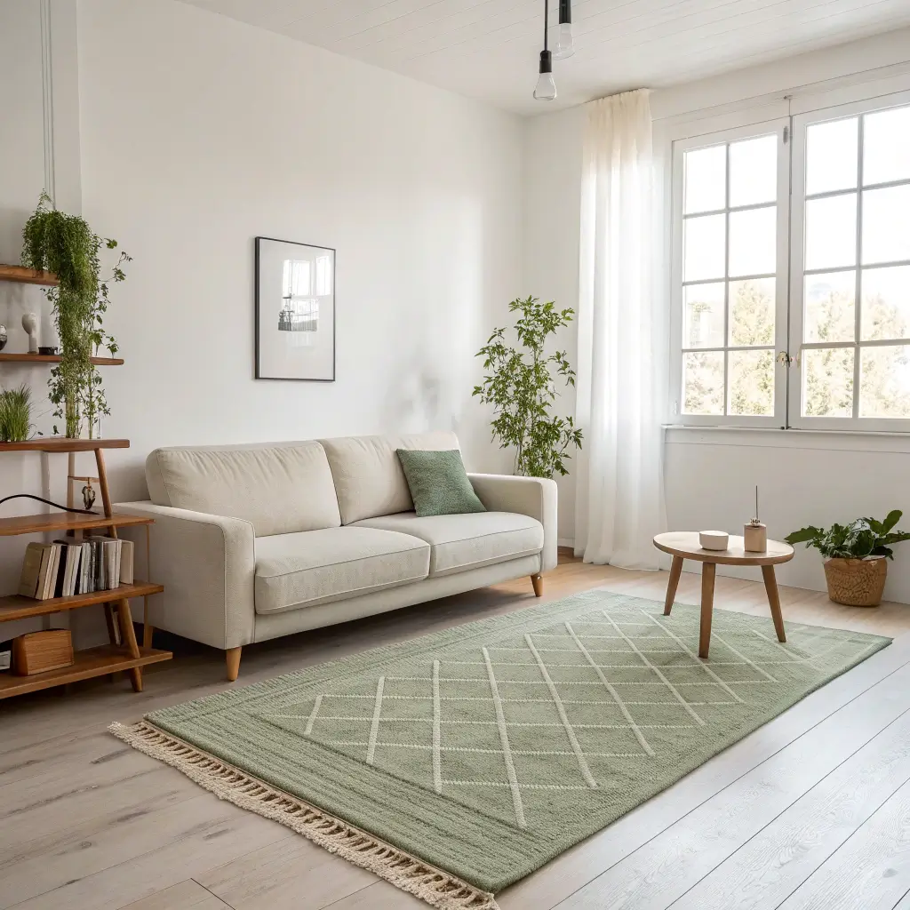 In my open-plan apartment, I use a large sage green rug to define the living area. It creates a clear boundary between the living and dining spaces while maintaining visual flow. The key is choosing a green that complements, not competes with, other areas.