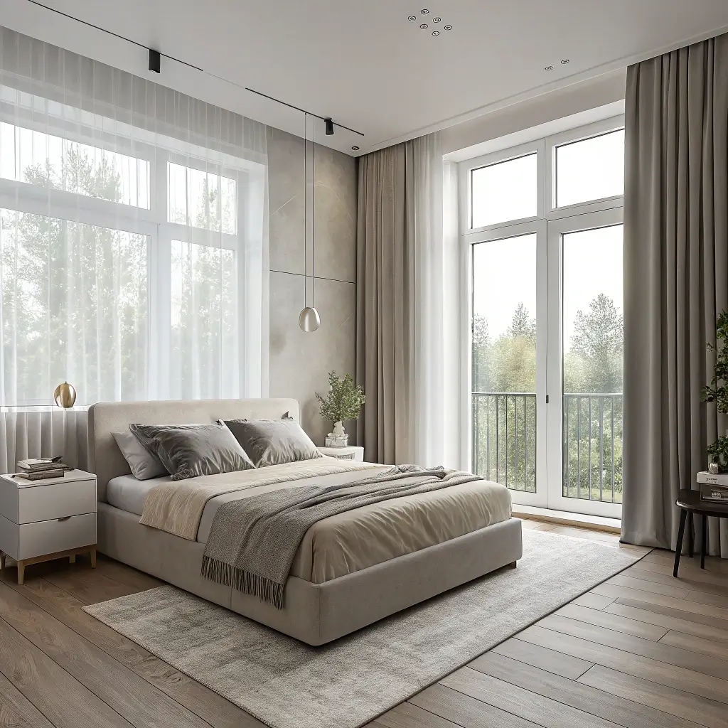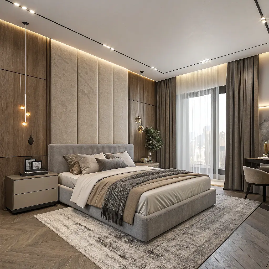 Think floor-to-ceiling curtains in soft grey, a beige upholstered headboard that reaches halfway up the wall, and maybe even a seating area with a sleek grey loveseat. The beauty of going modern? You can incorporate technology seamlessly – built-in USB outlets, smart lighting, the works.