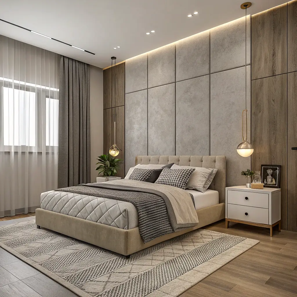 Consider zones in larger bedrooms. A sleeping zone, a dressing area, maybe even a work nook. Use area rugs in coordinating grey and beige tones to define each space without building walls.