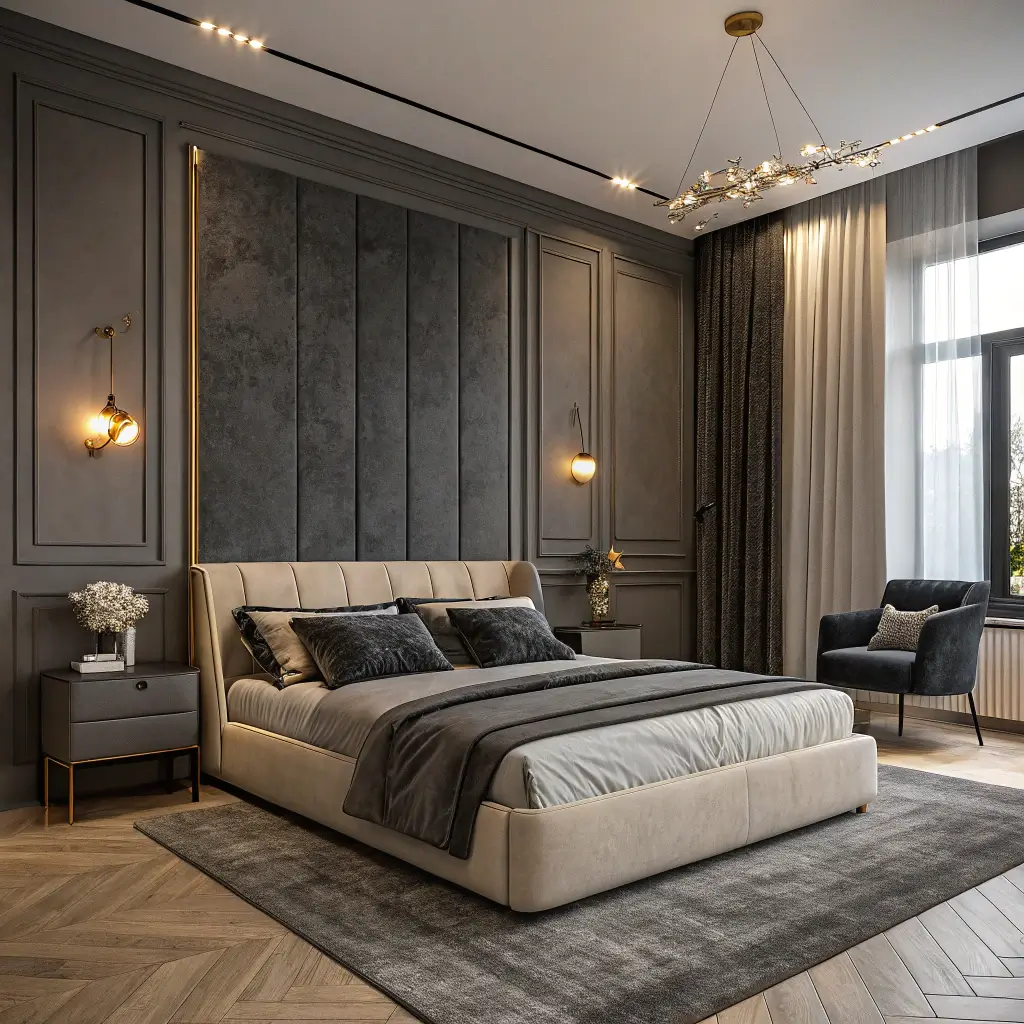 Charcoal grey accent walls behind beige upholstered headboards create stunning focal points. Add black metal light fixtures, dark wood furniture legs, or even black-framed artwork. The contrast makes both the light and dark elements pop more.