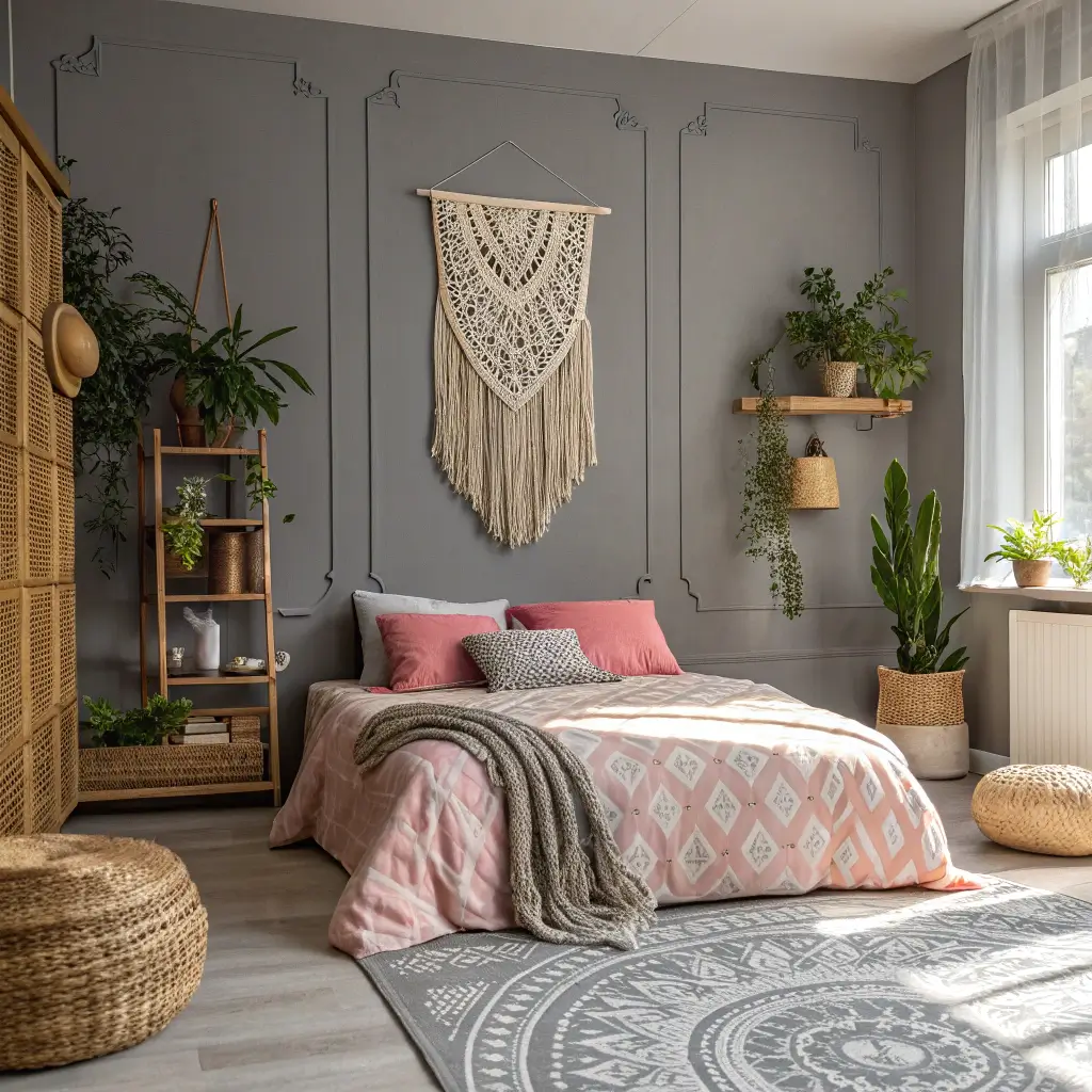 Grey and Pink Boho Chic Bedroom