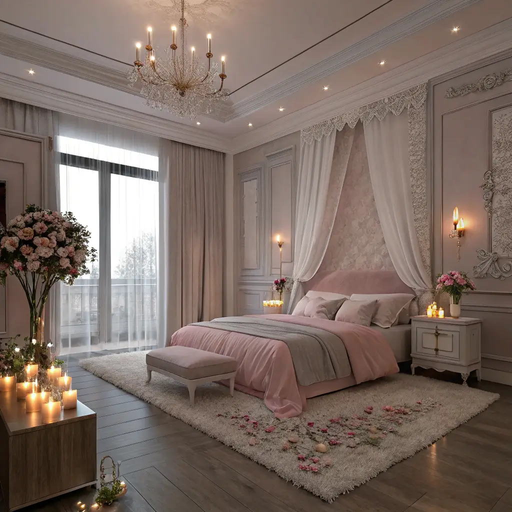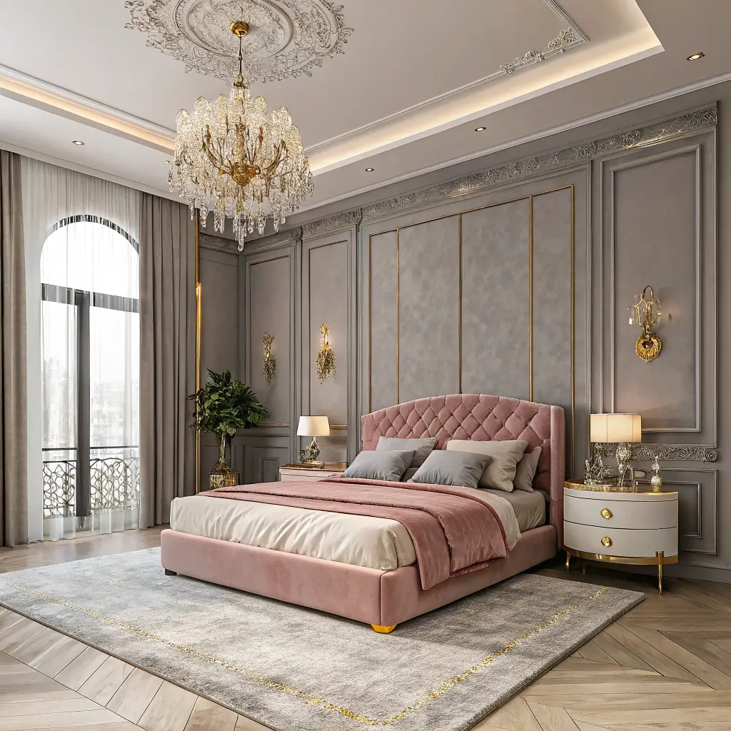Layer your lighting with a statement chandelier, bedside sconces, and hidden LED strips. A grey silk rug underfoot, pink silk curtains at the windows, and maybe a grey velvet ottoman with pink piping at the foot of your bed. Every element should feel intentional and indulgent.