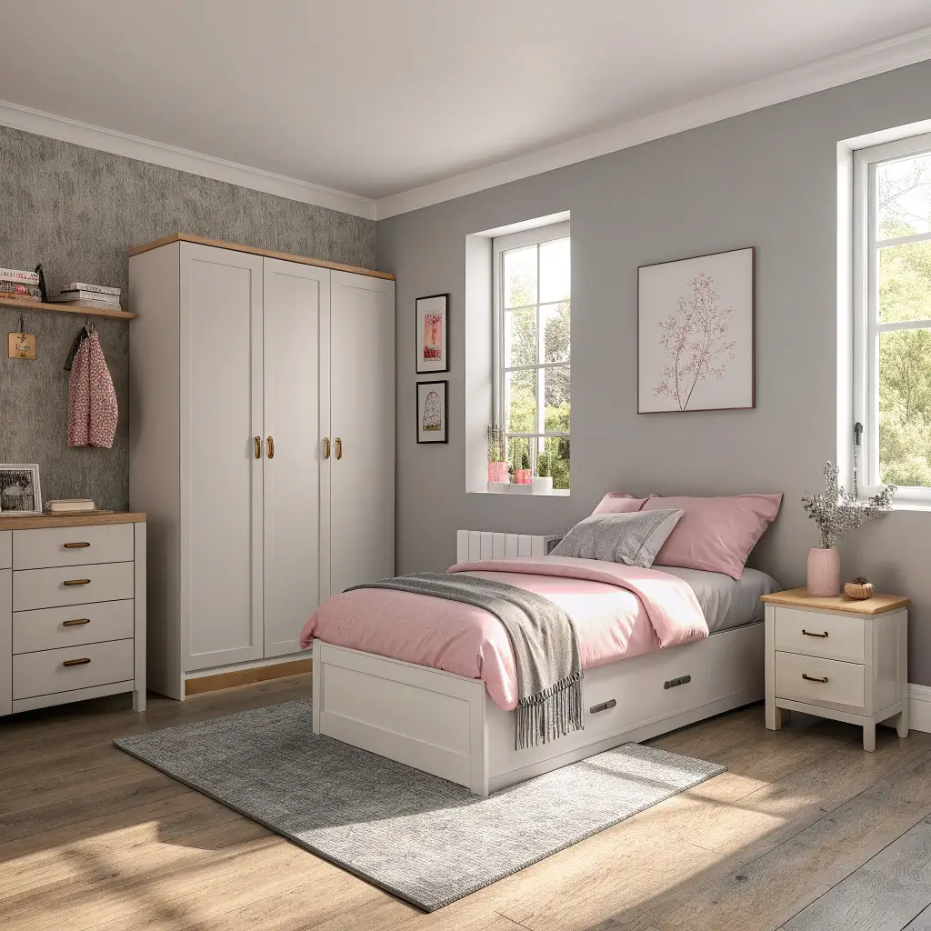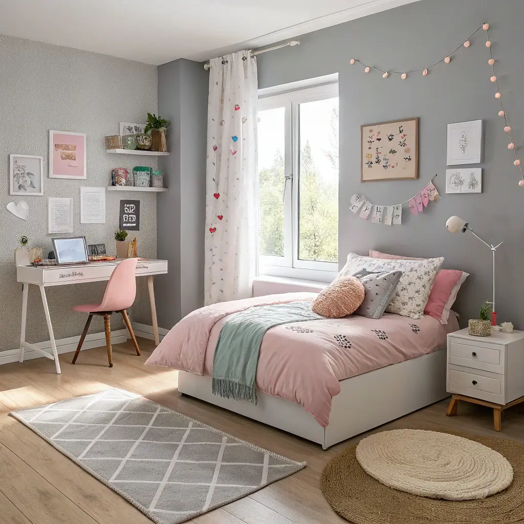 Vertical storage in grey keeps things streamlined. Mount shelves high, choose tall dressers over wide ones, and consider a loft bed if ceiling height allows. Pink accents draw the eye strategically – a pink ceiling (trust me on this) makes walls appear taller, while pink curtains hung close to the ceiling elongate windows.