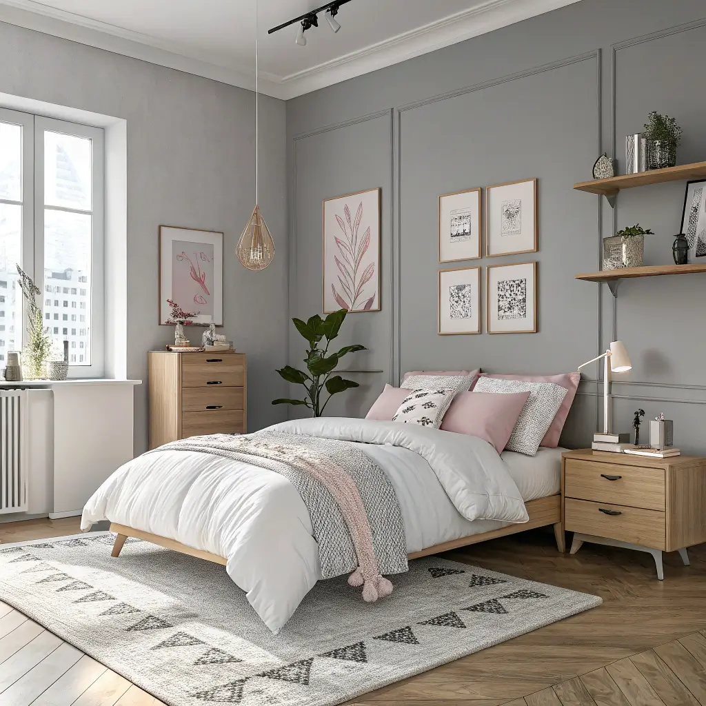 Keep walls light grey or white, then layer in darker grey textiles and pale pink accents. Natural wood furniture is non-negotiable here. Choose pieces in light oak or birch to maintain that airy Scandi feel. A sheepskin rug draped over a grey chair with a pink throw pillow? Chef’s kiss.