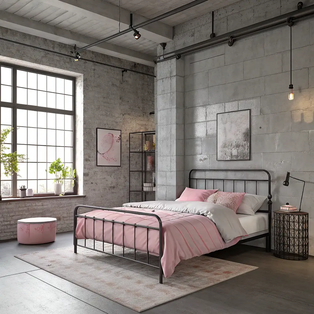 Start with classic industrial elements – exposed brick painted grey, metal bed frame, concrete floors. Then subvert expectations with pink textiles. A fluffy pink rug on concrete floors? Genius. Pink throw blanket on a metal bed? Unexpected perfection. The contrast between hard and soft, masculine and feminine, creates dynamic tension that keeps things interesting.