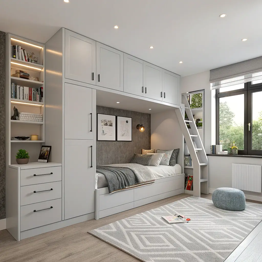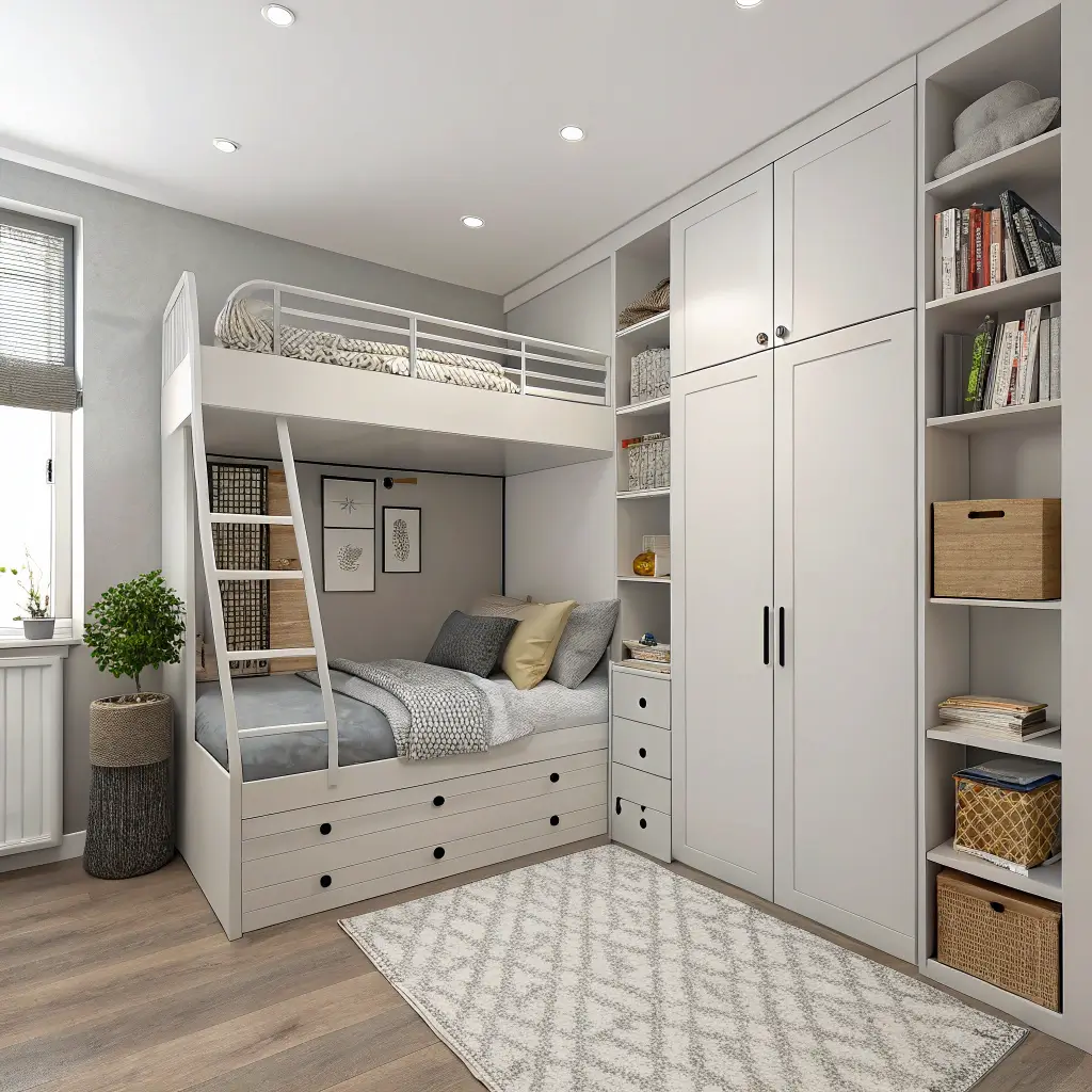 Built-in wardrobes painted in soft grey disappear into the walls. Floating shelves in white display your prettiest items while hiding the chaos in closed storage below. Under-bed storage boxes in grey fabric blend seamlessly when visible.