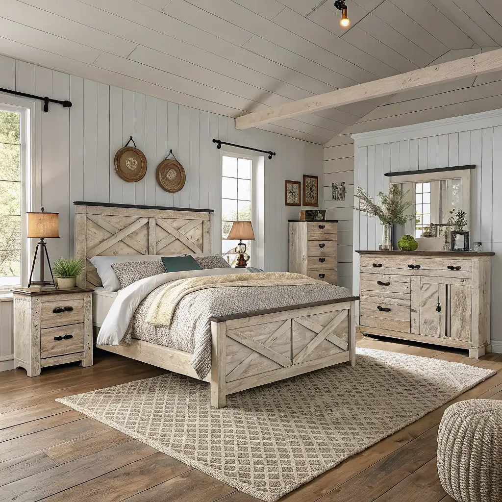 Start by painting that honey-colored wood furniture in weathered grey chalk paint. Keep some natural wood elements – maybe a reclaimed wood accent wall painted in whitewash with grey undertones. The combination of textures is what sells the rustic vibe.