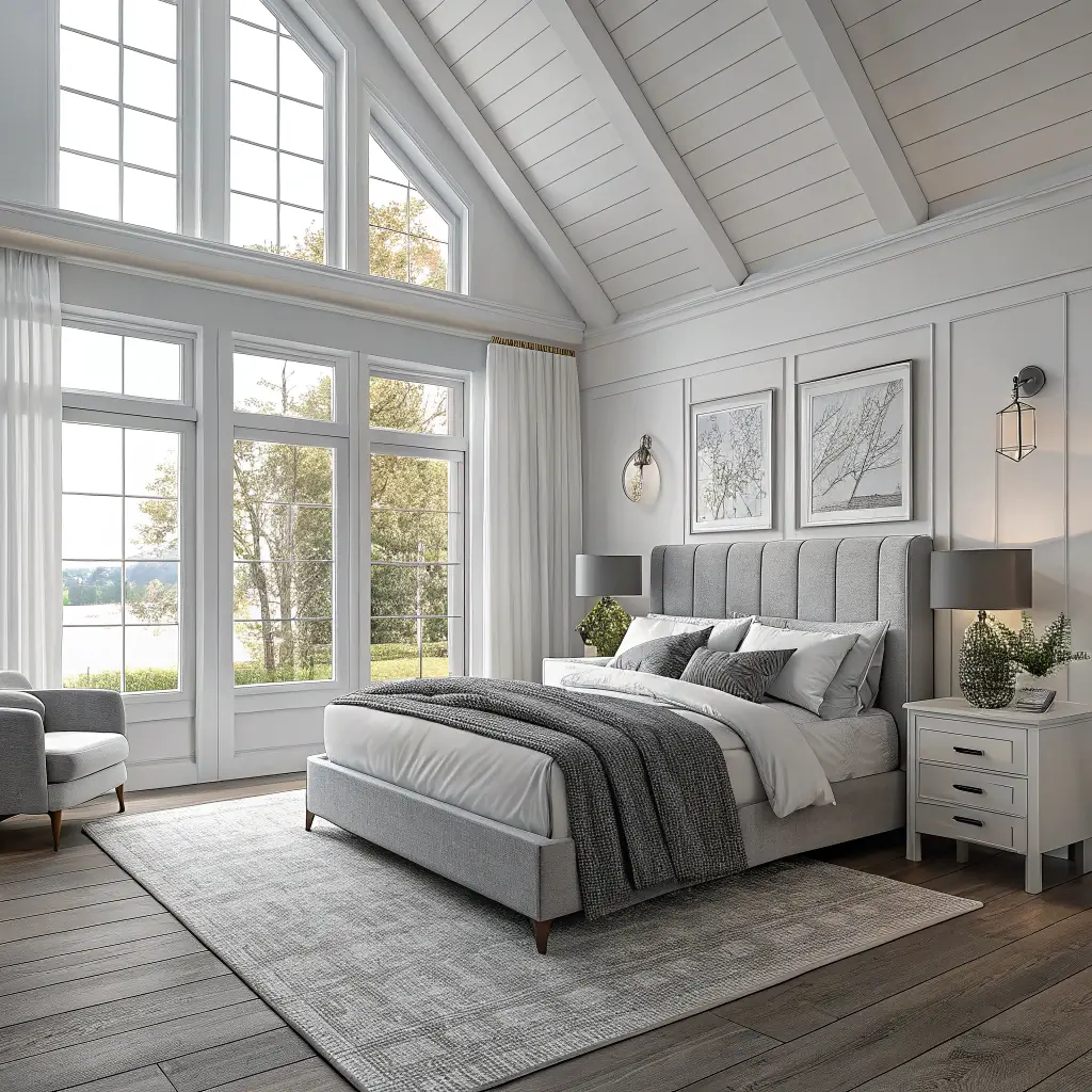 Position your bed to face the windows if possible. Use sheer white curtains layered with grey blackout panels – you get privacy without sacrificing light. Paint the window trim bright white to create a frame that draws the eye.
