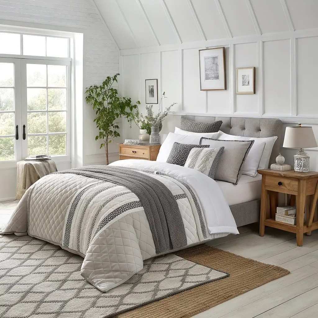 Add texture through chunky knit throws in various shades of grey, white linen curtains that puddle just slightly on the floor, and maybe a vintage white metal bed frame if you’re feeling authentic. The result? A space that feels like a high-end farmhouse hotel room.