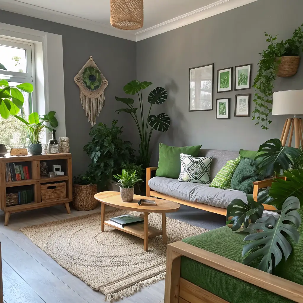 The warm grey provides a neutral backdrop, while wood elements complement the natural vibe of plants. I started with one succulent and now have 15 plants in my living room. No regrets.