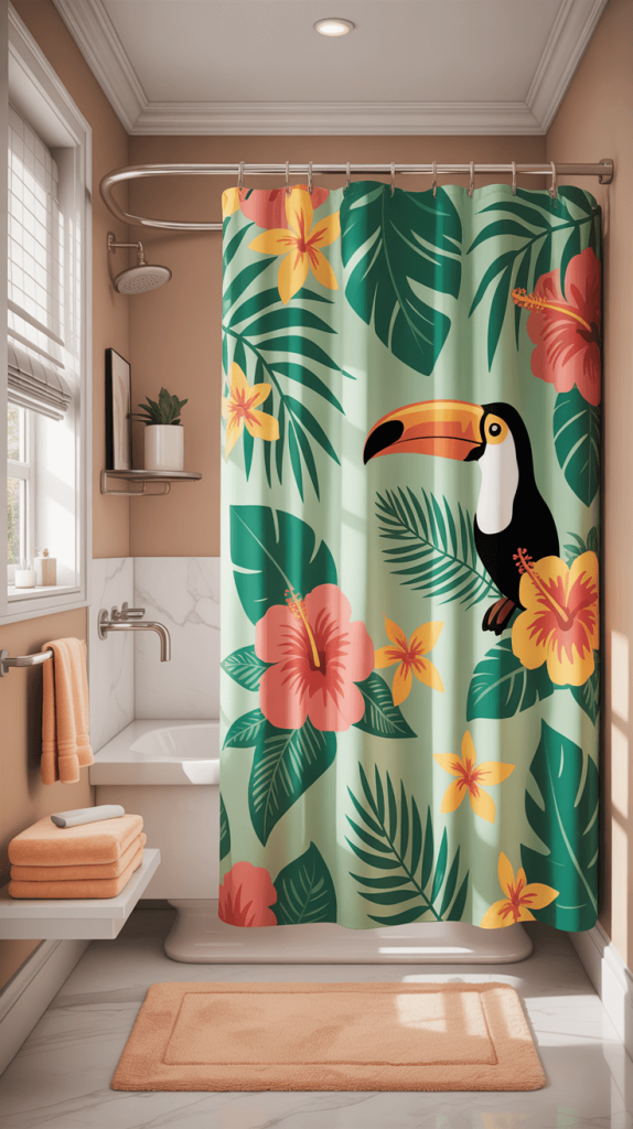 Not ready to commit to a full tile overhaul in the shower? No problem. The shower curtain is your canvas. It’s the largest swath of fabric in the room and has the power to dictate the entire color scheme and mood.