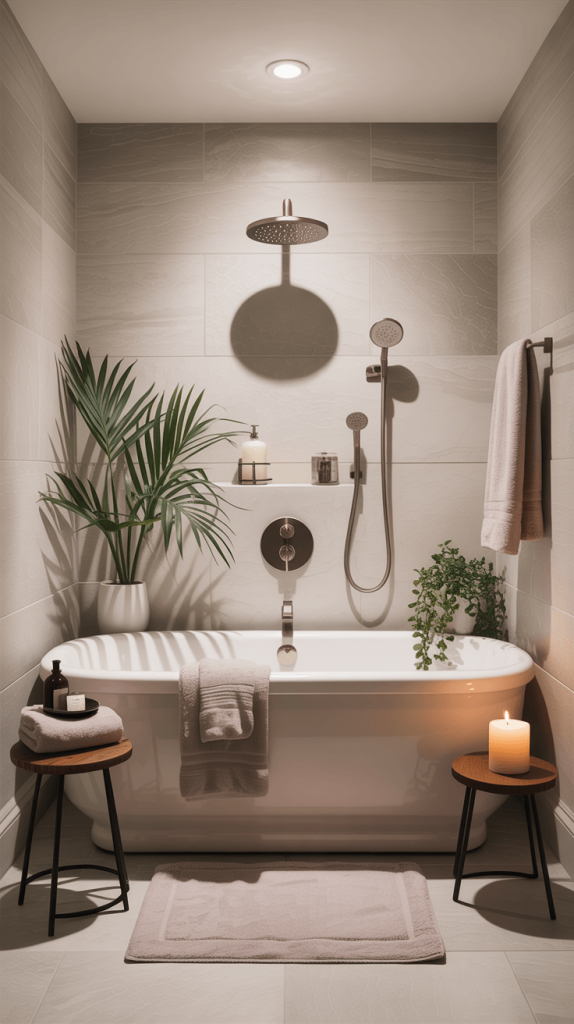- Design Details: Use large-format tiles on the wall and floor to minimize grout lines and enhance the clean, minimalist aesthetic. A built-in niche for shampoo and soap keeps everything looking tidy.