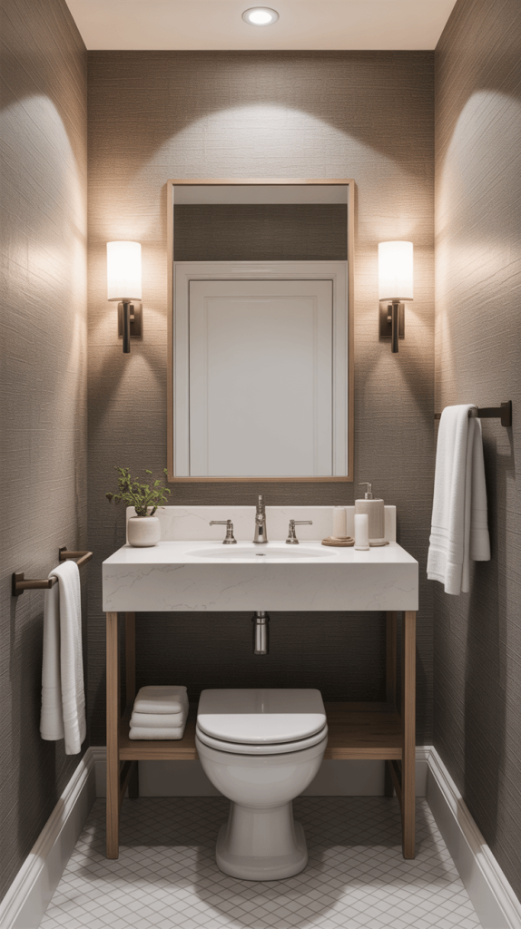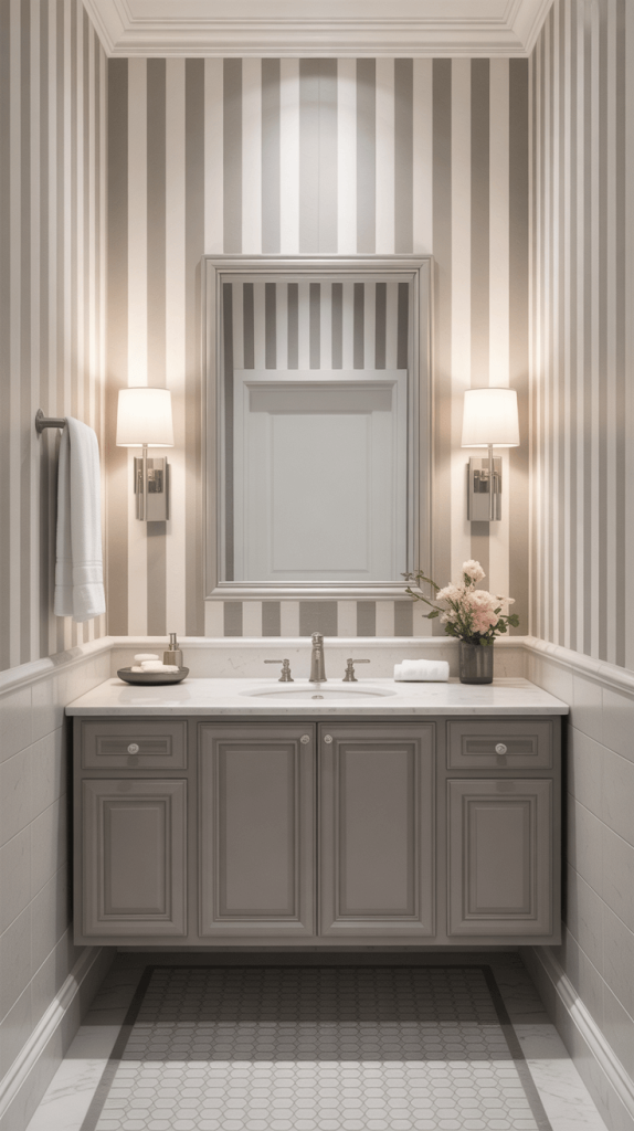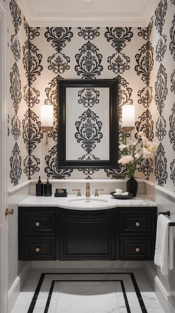 This wallpaper idea is perfect for small guest bathrooms that need to maximize visual space while still looking elegant and refined.
