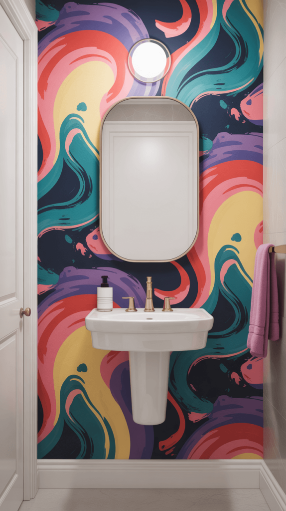 For a guest bathroom that’s truly unique, abstract art-inspired wallpaper is a fantastic option.