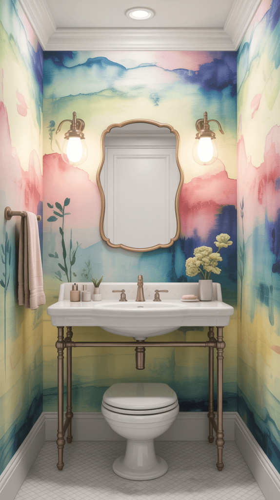 Watercolor wallpaper offers a soft, artistic flair that works well in guest bathrooms aiming for a peaceful, artistic vibe.
