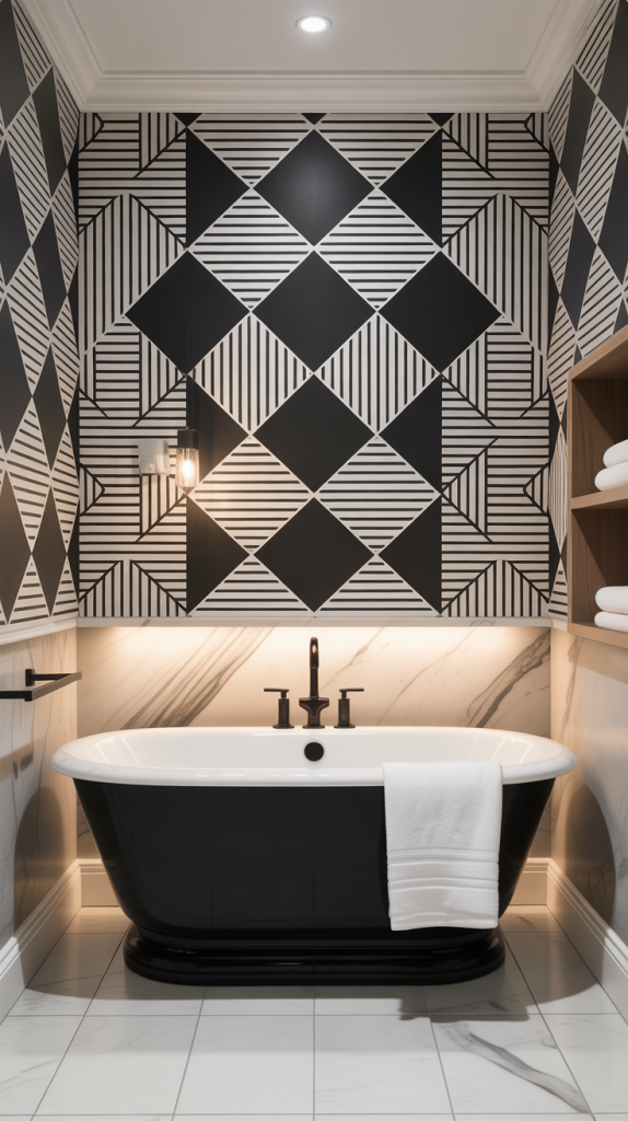 Geometric designs work well in both large and small bathrooms. In smaller rooms, lighter tones or subtle patterns can keep the space from feeling too busy. Pairing geometric wallpaper with sleek, modern fixtures or wooden accents will give your guest bathroom a high-end, sophisticated look.