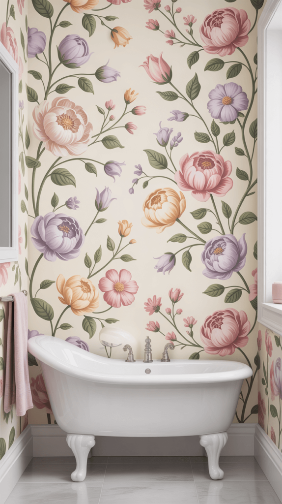 Floral wallpaper can also be used in smaller bathrooms to create the illusion of a bigger, more open space.