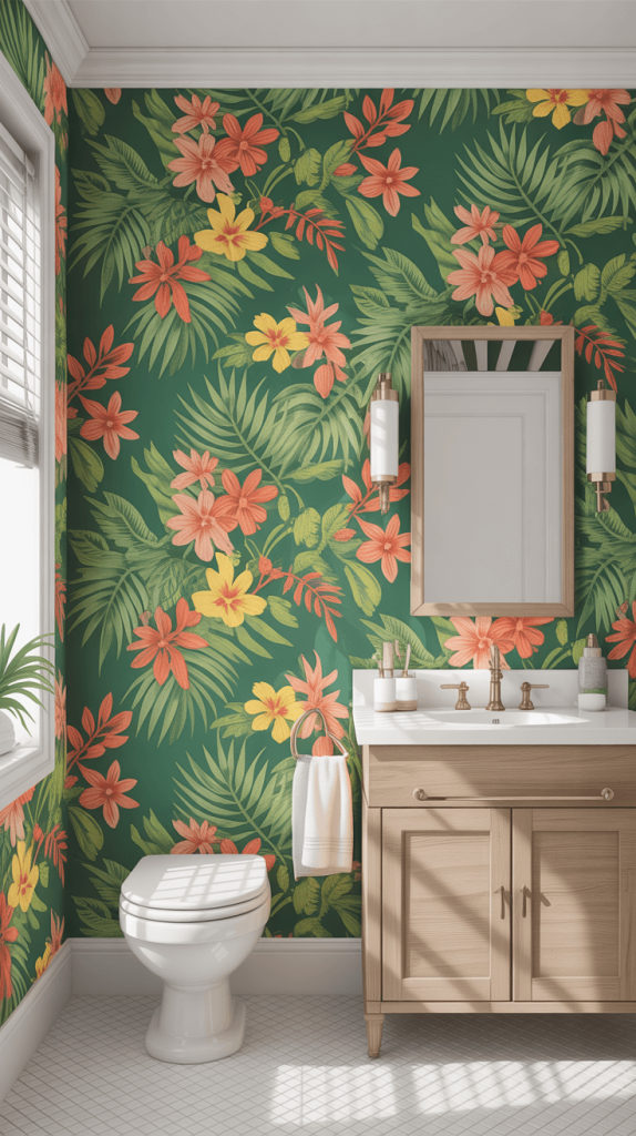Tropical prints work well with neutral fixtures like beige or white, allowing the wallpaper to become the focal point of the room.