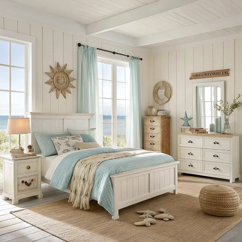 Start with a white or light blue base and layer in natural textures. Weathered wood furniture, jute rugs, and linen bedding create that effortless coastal look. Add some nautical elements, but please, go easy on the anchors and sailboats – we’re going for subtle, not seafood restaurant.