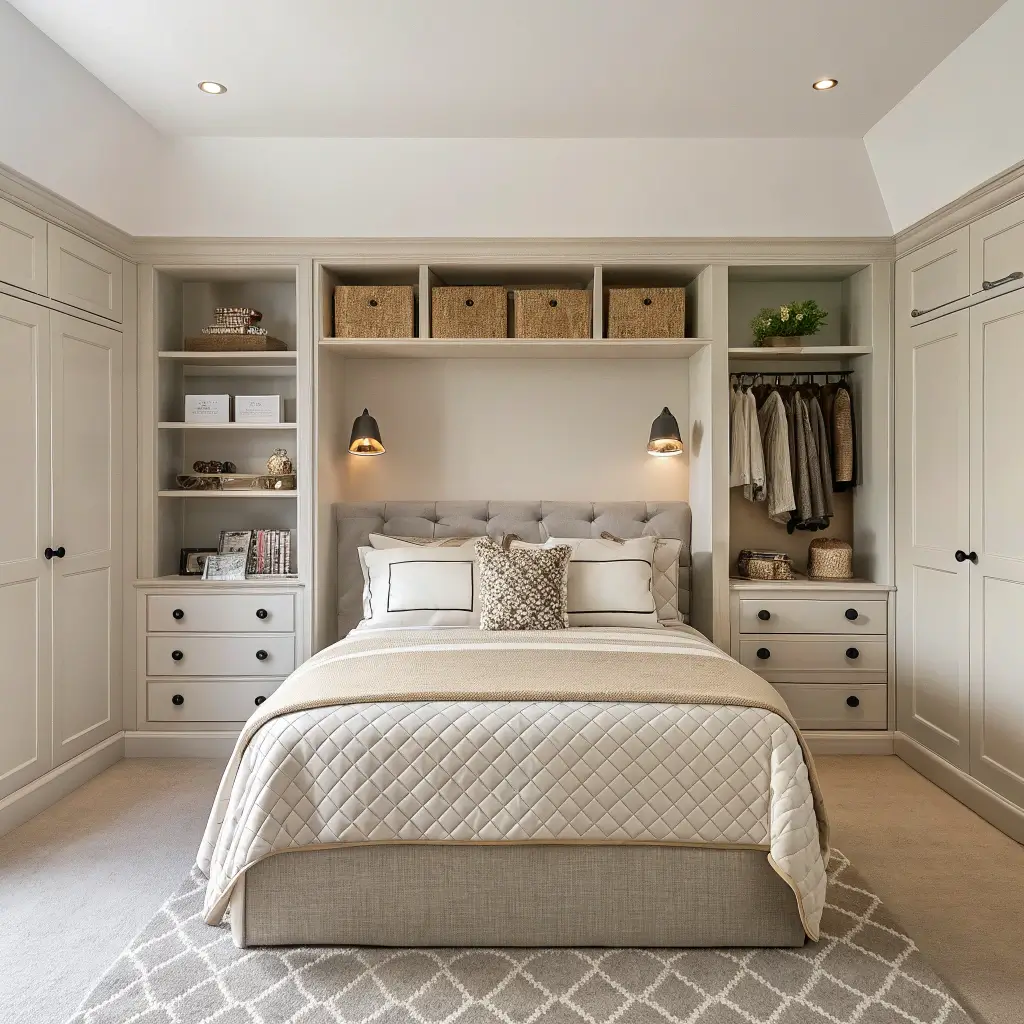 Bedside tables with drawers keep surfaces clutter-free while providing space for personal items. And here’s a tip that changed my life: add a luggage rack or bench. It’s elegant, practical, and saves your bedding from becoming a suitcase stand.