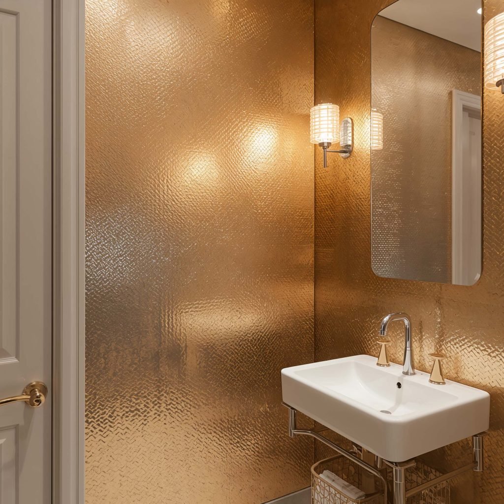 Okay, hear me out on this one. Metallic foil wallpaper sounds extra, but it’s actually genius for half bathrooms. Why? Because these spaces typically have limited natural light, and metallics reflect what little light you do have.