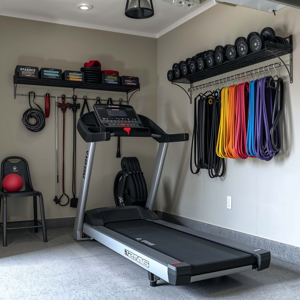 Here’s where things get interesting. Install floating shelves at different heights for your smaller equipment. Keep resistance bands on the lowest shelf, kettlebells on the middle, and lighter items up top. This vertical approach saves massive floor space while keeping everything accessible.