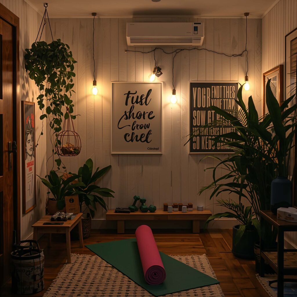 Exposed brick walls (or faux brick panels if you’re renting), black rubber flooring, and Edison bulb string lights create this amazing industrial vibe. Add a large mirror on one wall – not just for checking form but because it doubles the visual space. I mounted mine from Marketplace for $40, and it completely transformed the feel of my setup.