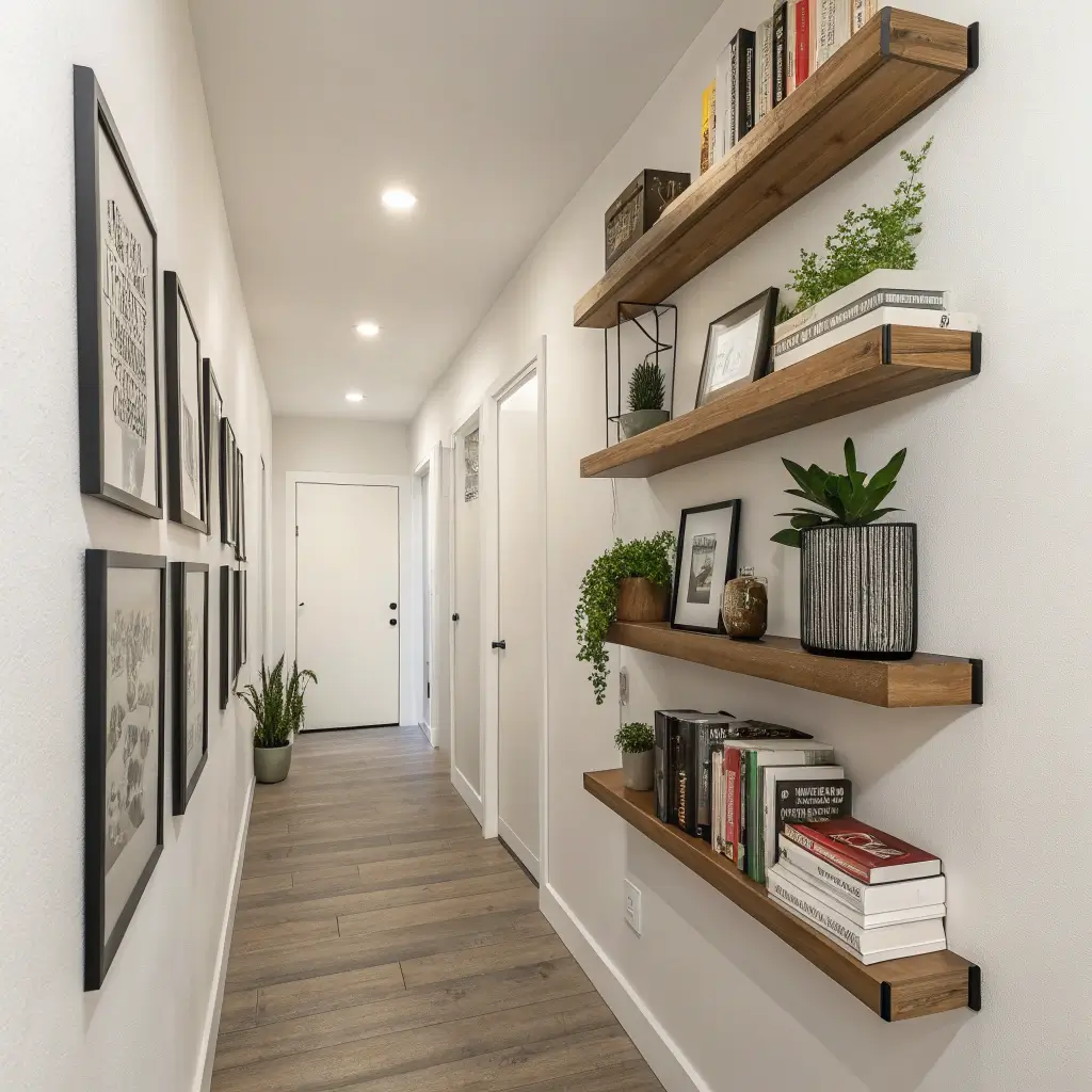 Floating shelves might be the most underrated hallway hero. They add storage, display space, and visual interest without eating up precious floor space. Plus, installation is easier than you’d think.